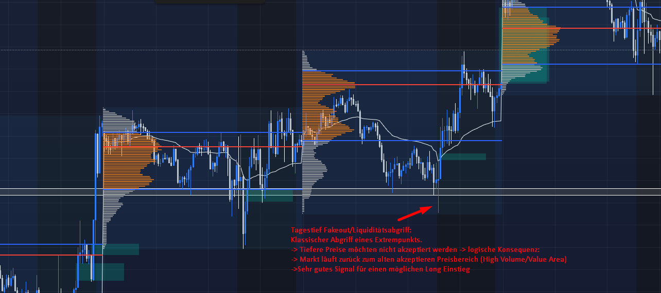 Zusätzlich hat der Markt im Vorfeld eine saubere Short-Struktur mit klarer Short-Price-Action aufgebaut. Direkt an der Volumenbergkante bildete sich ein tieferes Hoch (Lower High), was die vorherrschende Abwärtsstruktur bestätigte und ein weiteres technisches Signal für den Short-Einstieg lieferte. Die Price-Action war damit nicht nur visuell eindeutig, sondern auch strukturell stimmig.